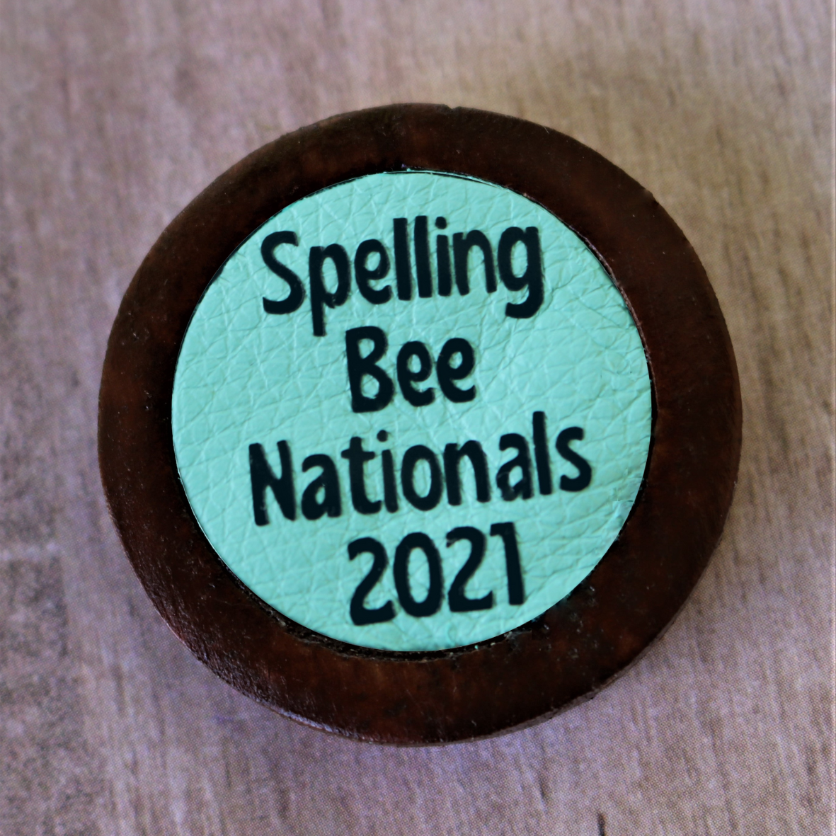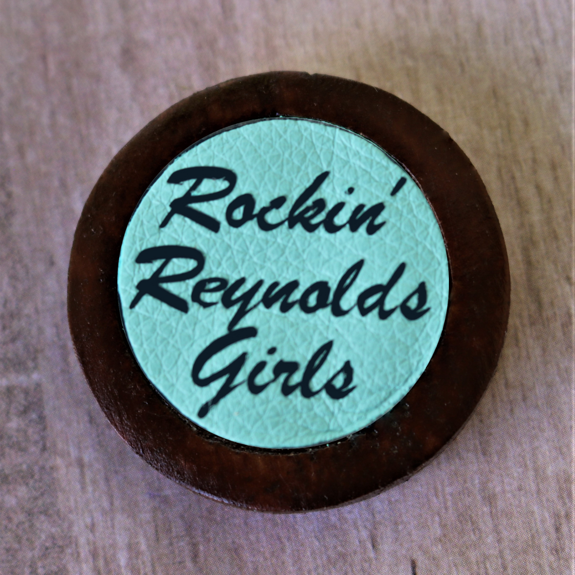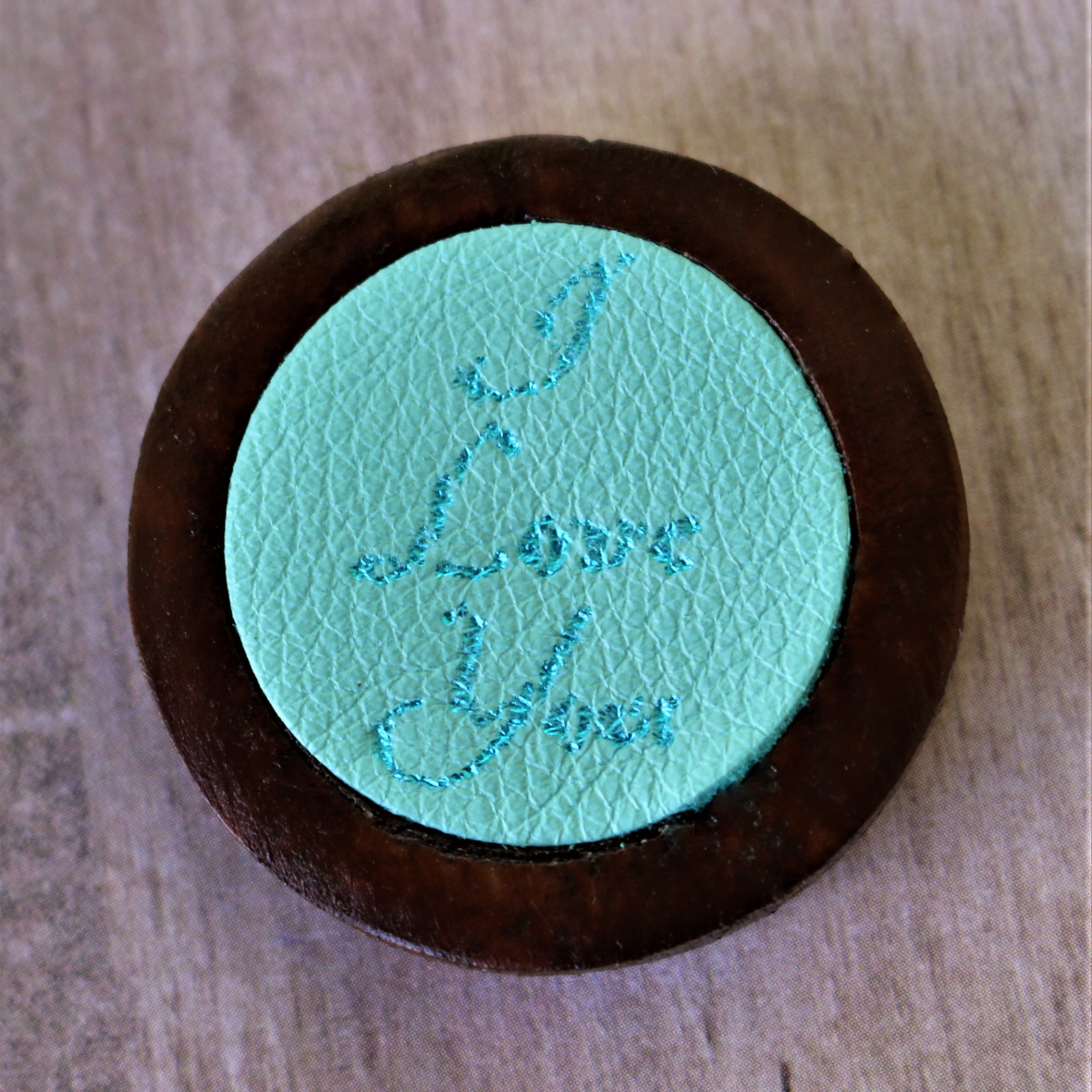 Dark walnut wood tokens are stained a deep, rich red-brown color and measure 1.5" in diameter. The teal vegan leather insert can be customized with your choice of metallic foil or vinyl lettering.